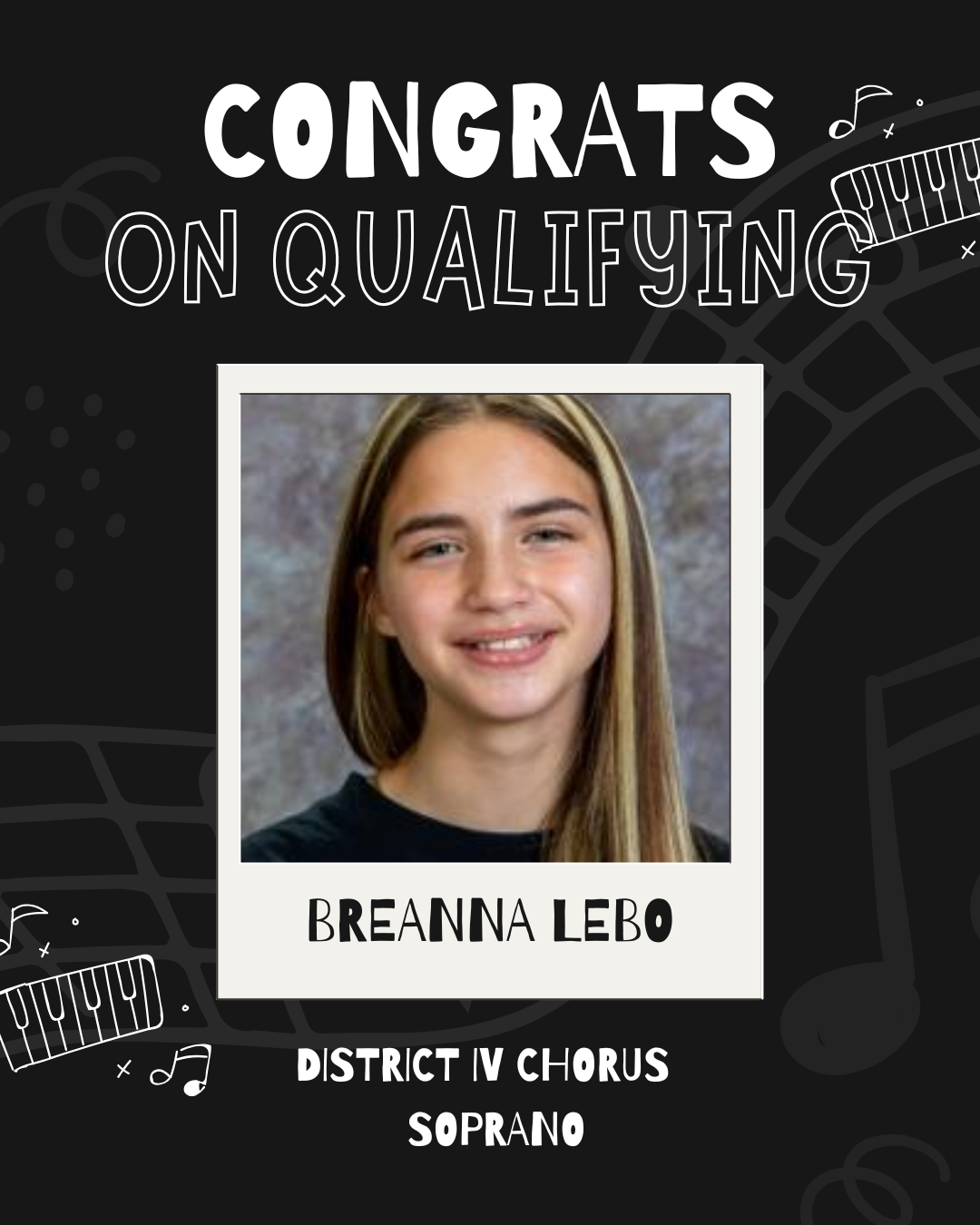Congratulations to Breanna Lebo for qualifying for District Four Chorus as a Soprano! She performed in the Top 30 of all sopranos who auditioned. She now has the opportunity to attend the District Four Middle School Chorus event in February as a representative for Smithfield Middle School Chorus and Isle of Wight County Schools. Way to go, Breanna!